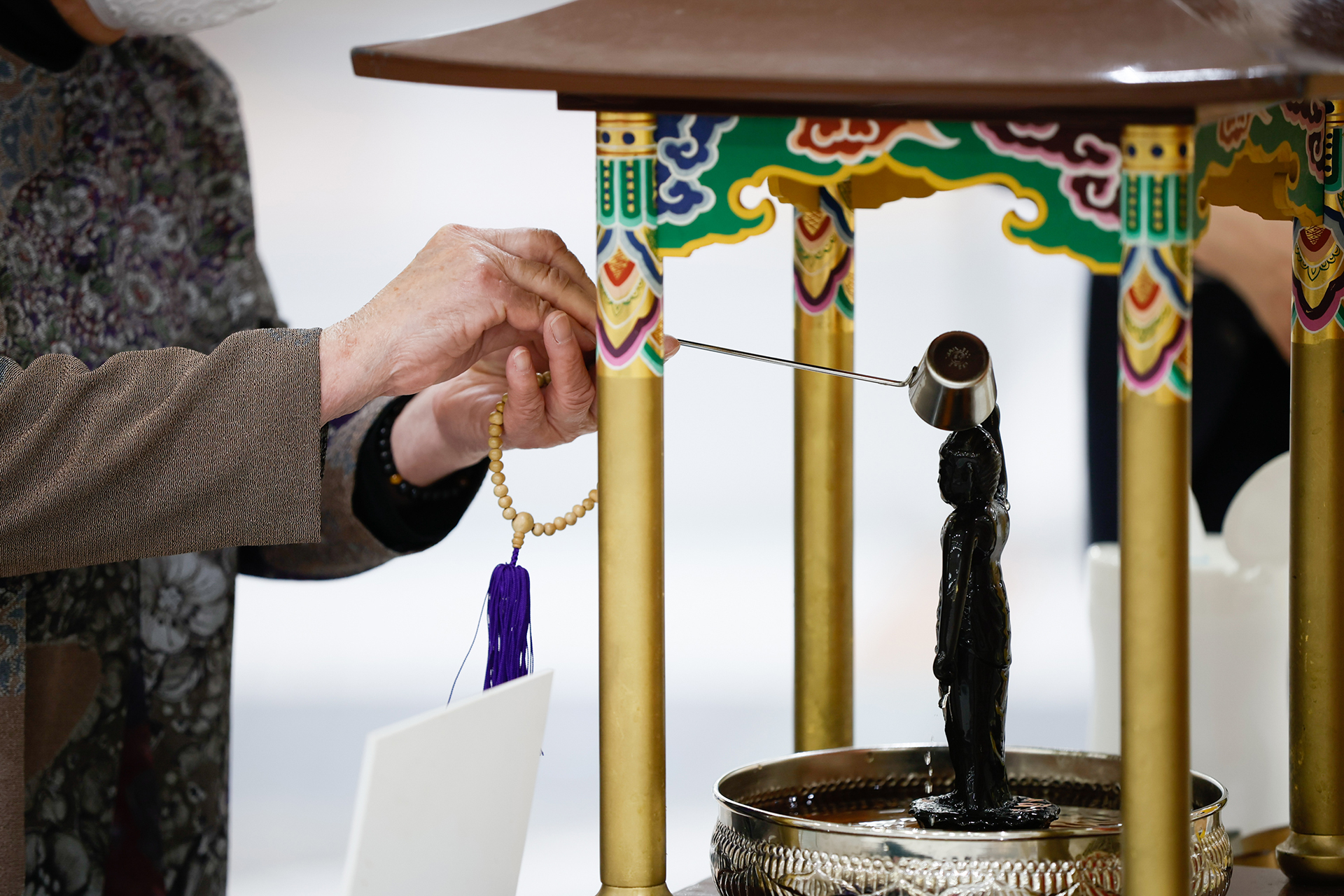 どうぞご一緒に甘茶をかけてお釈迦さまのお誕生をお祝いいたしましょう。