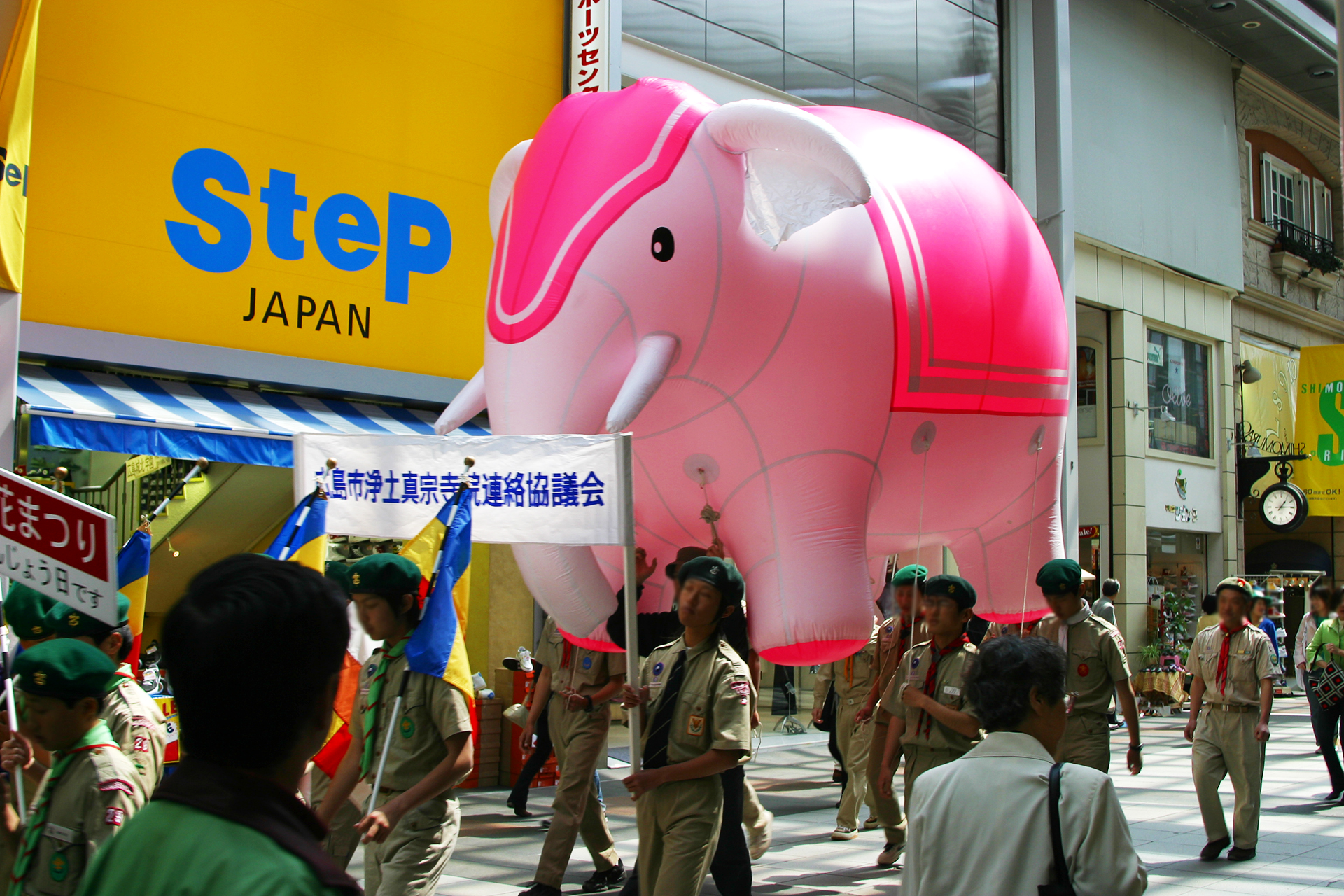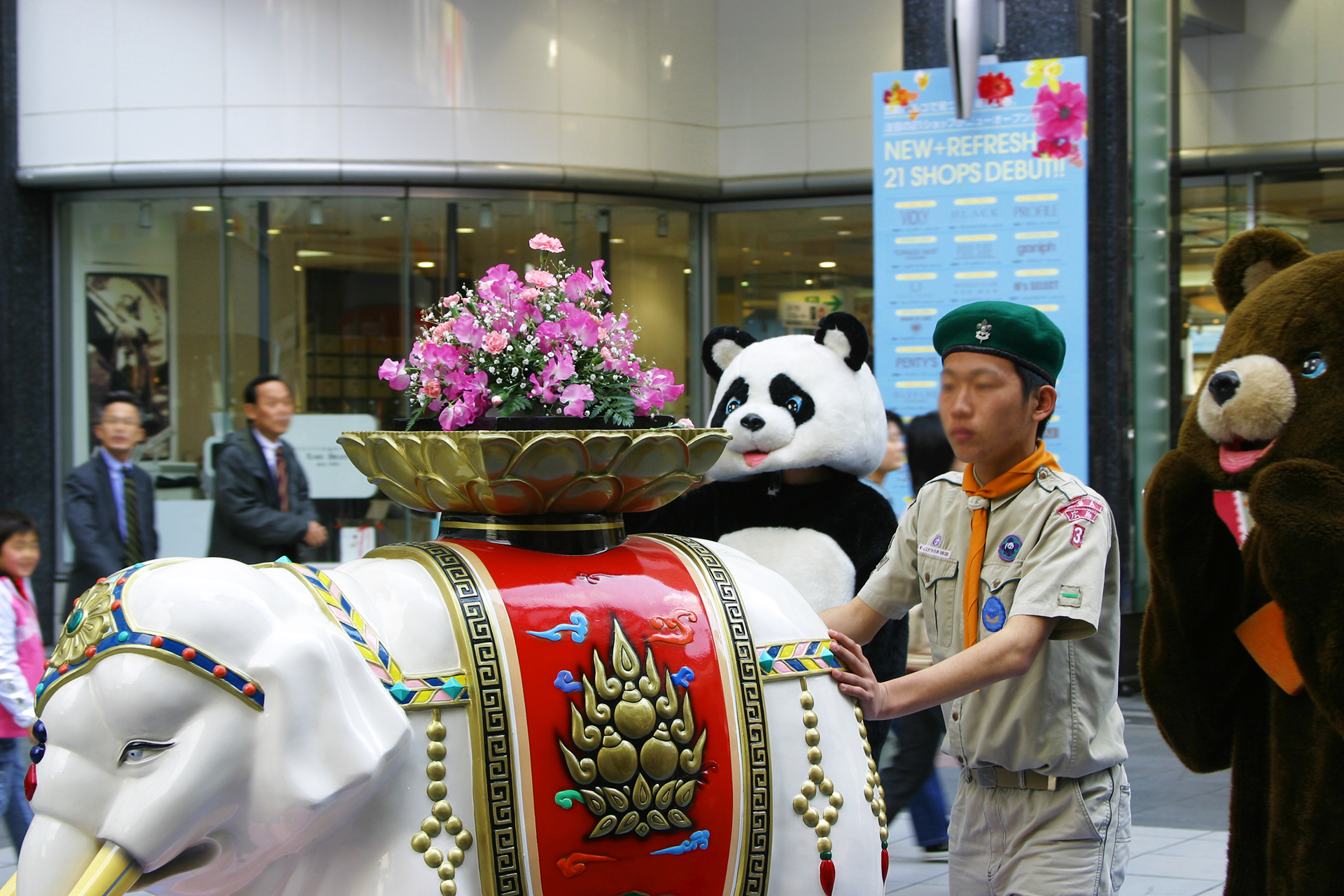 ボーイスカウト・ガールスカウトの先導や、あおぞら金管合奏団の演奏に合わせ、大きな白象のバルーンを引き連れた一団で行進します。