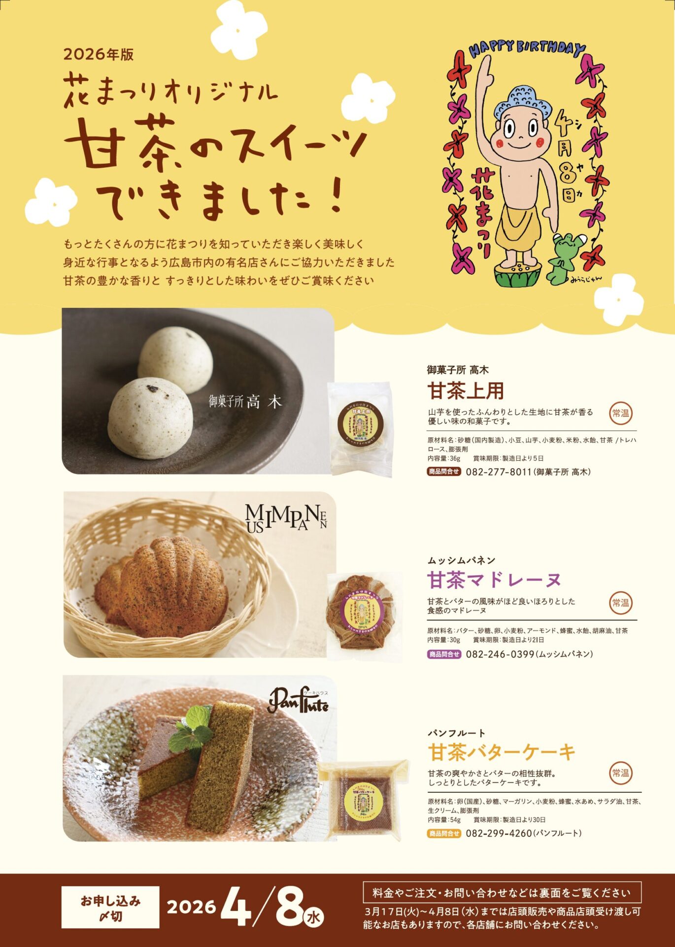 花まつりと言えば「甘茶」ということで、広島市内の有名店にご協力をいただき、甘茶にちなんだスイーツを作りました。